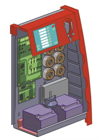 Koko tekniikka kätevästi seinään asennettavassa kotelomallisessa ratkaisussa. Tehovahvistimet, kaiutinlinjayksiköt, liitännäiskortit sekä tietysti akusto ja laturi järjestelmän varavoimaa varten.